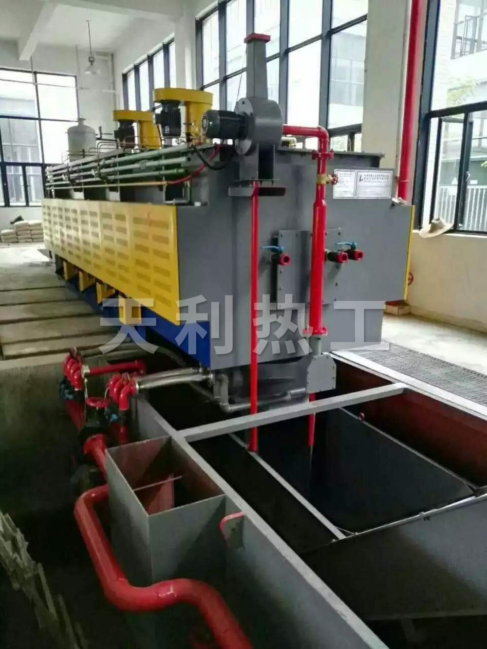 淬火池是淬火的場所,就是一個池子,里面有水溶液或者是油,就是箱式爐出來的工件淬火的冷卻的地方,一般就是直接丟進(jìn)去,然后等一段時間撈出來。還有其他的一些設(shè)備,比如高頻機(jī),就是一個可以將 50 赫茲的工頻電變成一個200K 赫茲電流的超大功率的設(shè)備,比如常見的有 200 千瓦的***大功率,然后用一個內(nèi)部通冷卻水的銅管做的線圈放在工件的外面,一般幾十毫米的工件,幾秒種到十幾秒的時候你就看到工 件表面變紅,表面溫度到預(yù)定值的時候,然后有一個水套升上來噴淬火液到工件 表面,完成淬火過程。常見的就這些了。